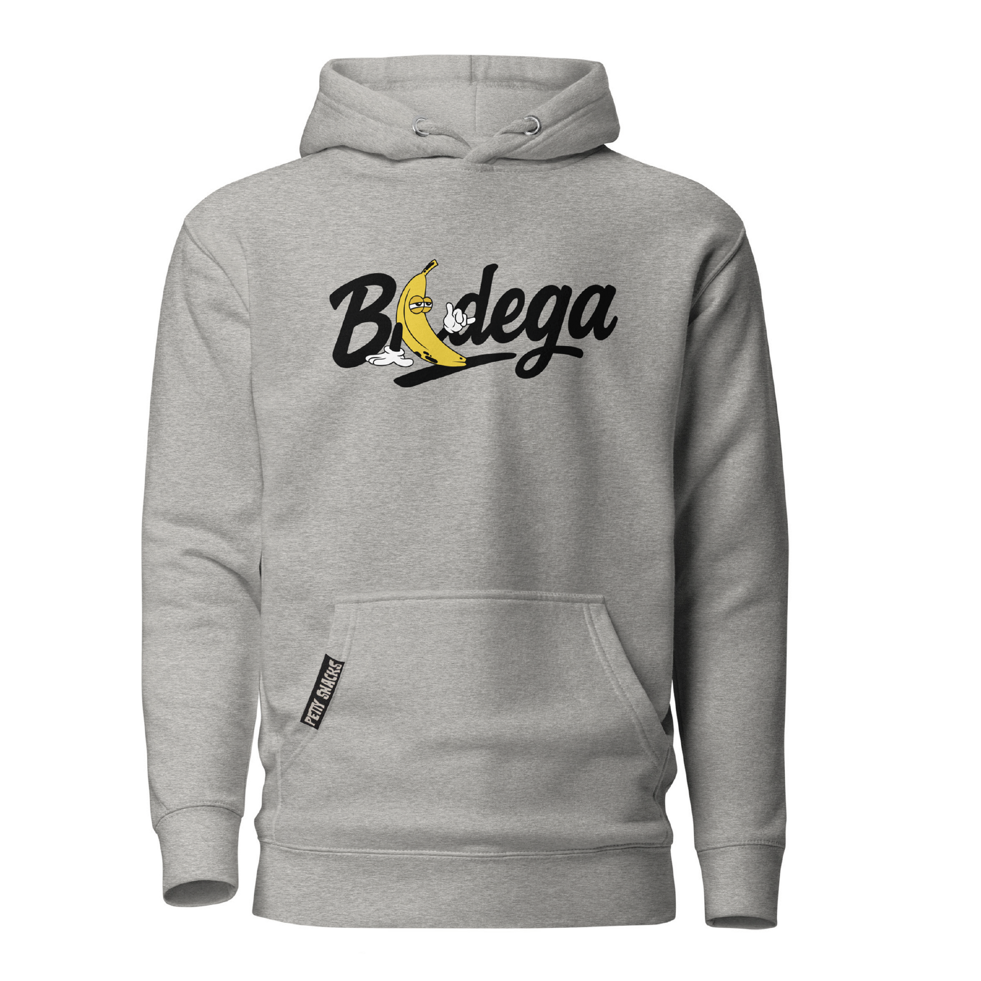 Large center text on Grey Hoodie, Bananthony's Bodega shop logo. Black text "Bodega" with classic yellow Bananthony logo acting as the letter "O".